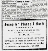 A Planes, republicano de pro, le dieron matarile esos revolucionarios de gatillo fácil y consignas baratas que fueron los anarquistas, que lo mismo mataban a Cánovas mientras leía el periódico que a Canalejas mientras miraba el escaparte de una librería. De tipos que asesinan a pacíficos lectores se puede esperar cualquier cosa. Por ejemplo, que no se tomen con sentido del humor las denuncias sistemáticas, sostenidas y argumentadas que hacía Planes desde su revista El Be Negre, donde ponía en relación la violencia ideológica de los anarquistas kropotkianos de la FAI con el ethos extorsionador y criminal de la Mafia. Para darle un escarmiento, a la vez que la razón, los de la FAI ahorraron a los franquistas las siete balas que le incrustaron en el cráneo (¿a bala por artículo de denuncia?). Balas que son medallas en su haber.