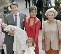 La sexta nieta de la reina Beatriz, que ocupa el séptimo puesto en la línea de sucesión al trono, recibió al nacer (el pasado 3 de junio), como sus hermanos: Eloísa Sofía (2002) y Claus Casimir (2004), el título de Condesa de Orange-Nassau. Ha sido bautizada con el nombre de Leonore Marie Irene Enrica. Aunque los padres de la pequeña optaron por una celebración eminentemente privada, numerosos curiosos no quisieron desaprovechar la oportunidad de demostrar su cariño a la Familia Real holandesa.
