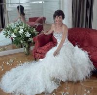 Carmen estaba espectacular, con un traje realizado en voile de organza de seda natural en color blanco roto de línea fluida y escote palabra de honor (arrasan en los catálogos de novias). El modelo, según explicaba el diseñador, se había construido a partir de un corsé interno, ajustado hasta la cadera, del que partía una faldea evasé con una cola casi de un metro. Mención aparte merece el trabajo de este traje, bordado con canutillo de plata vieja y cristal tallado, inspirado en la joyería decó y bordado en los talleres de Luguel. Nada menos que 200 horas de trabajo fueron necesarias para bordar las más de 3.000 piedras de cristal de diferentes tamaños que adornaban el vestido, cuya falda estaba adornada por plumas de avestruz.