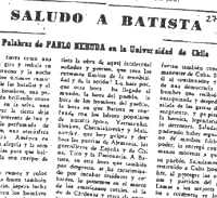 Y sigue: "Batista, como hombre del pueblo, ha comprendido mejor que muchos demagogos el papel de los intelectuales, y honra a toda América (…) Los chilenos damos hoy la mano a Fulgencio Batista… Saludamos en él al continuador y restaurador de una democracia hermana". Y así todo, más saludos de Neruda, hasta definir a Batista como libertador, uno de los grandes "que han ayudado a que su fulgor nos ilumine en el camino de la libertad y de la grandeza de América".