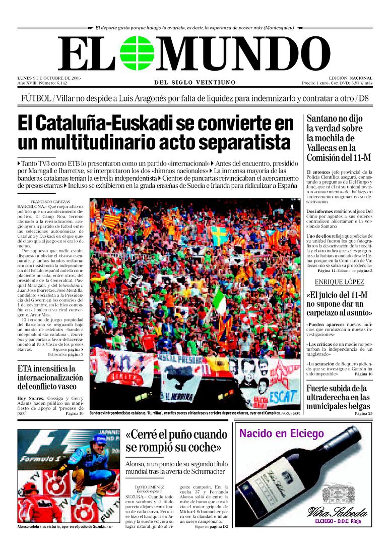 Gallardón ¿chantajeado?. HarryLib apunto un nombre que puede ser interesante Monserrat Corulla. Uno o dos dias después de la Operación Malaya, alguien tan poco dudoso de ser crítico con el Gobierno por el 11M como Pilar Cernuda, apuntó en Onda Cero que se comentaba la estrecha relación Gallardón-Corulla, que estaban registradas hasta sus llamadas telefónicas y sus contactos. ¿Podríamos encontrarnos en un caso de chantaje? ¿Puede estar alguien en posesión de esos papeles estar obligando a Gallardón a estar abrasándose en el tema del 11M? El Pis y la extrema derecha Muy significativa la coincidencia del frontal ataque de Ynestrillas a LdP con el artículo del Pis. Es público y notorio el esfuerzo que desde hace tiempo realizan los medios sumisos, para impulsar la extrema derecha. Tengo la impresión que nos vamos a sorprender las próximas elecciones por la calidad y abundancia de su propaganda. ¿Qué es lo que ocurre? Algo sencillo. Tanto para los fatxas de ZP como los fachas clasic, el guion no está saliendo como se esperaba. Ambos contaban, que la crisis nacional haría que el foco de resistencia fuera la conjunción derecha-extrema derecha, dando lugar a una subida de las posiciones ultras. Y eso ha fallado. La conjunción ha sido otra, sectores de la derecha (preferentemente los de pasado limpio no franquista) con sectores liberales y la poca izquierda independiente; la derecha de procedencia franquista (Fraga, Gallardón) en cambio se ha puesto de rodillas sin resistencia. Y de ahí el berrinche. En vez de DN y neofranquistas se encuentran movimientos ciudadanos, independientes, trasversales que en vez de rechazar la democracia, denuncian la permanente violacion de esta por el Poder, exigen regeneración democrática y mentan lo último que desean los políticos españoles: ¡Listas abiertas! Yo no voy a admitir lo de extrema derecha ni irónicamente. Como alguien dijo aquí, ZP si quieres ver un ultra mirate al espejo.