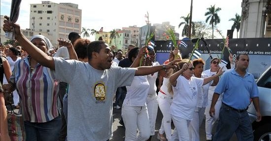 Las Damas de Blanco son un movimiento cubano que reúne a las esposas y otros familiares de los presos políticos a los que el régimen castrista considera presos comunes. El movimiento surgió en 2003, tras la llamada Primavera Negra de Cuba, cuando fueron arrestados decenas de detractores de Fidel Castro, conocidos desde entoncescomo el grupo de los 75. Las Damas de Blanco realizan concentraciones en defensa de los derechos de los presos políticos en la isla, portando retratos de sus familiares encarcelados y vestidas de blanco. Antes de las concentraciones asisten a la celebración de la Misa.