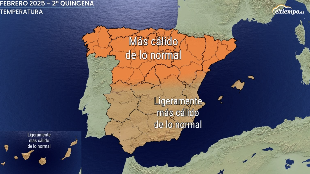 Después de un comienzo de año marcado por las borrascas y las lluvias en la mayor parte del país, el mes de febrero se presenta con la particularidad de que la segunda quincena será más cálida de lo normal, notándose esta subida de temperatura más en la mitad norte de la península que en la sur y siendo afectadas algunas regiones por la falta de lluvias.