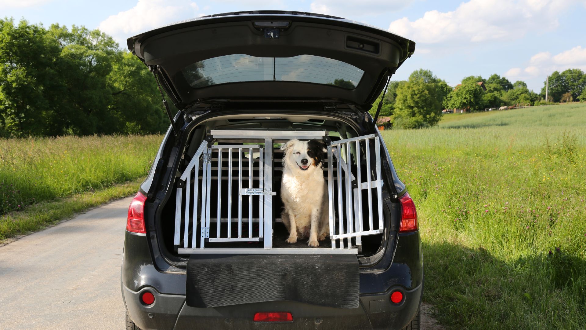 Transportines en el maletero para perros de gran tamaño (más de 55 kg), fijados a la carrocería para resistir un impacto frontal.
