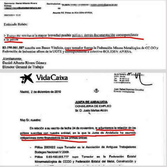 El director general de Trabajo y Seguridad Social, Daniel Rivera, envió un correo electrónico a un empleado de la división vida colectivos del grupo Generali el pasado 8 de marzo con el siguiente texto: "Estimado Rubén: Ruego me remitas a la mayor brevedad posible póliza y demás documentación correspondiente a la póliza 83-190.001.587 suscrita con Banco Vitalicio, cuyo tomador fueron [sic] la Federación Minero Metalúrgica de CCOO y Federación de Industrias afines de la UGT y correspondiente a colectivo Boliden Aprisa".