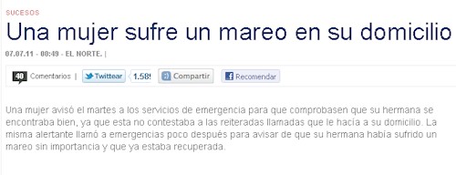 La noticia publicada en la web de El Norte de Castilla está revolucionando las redes sociales. Está colgada en la sección de sucesos de la edición de Palencia con el titular "Una mujer sufre un mareo en su domicilio". Ya es la más leída de todo el periódico.