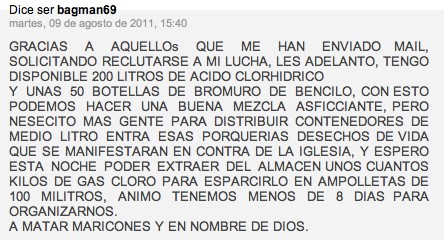 "Gracias a todos aquellos que me han enviado mail, solicitando reclutarse a mi lucha, les adelanto, tengo disponible 200 litros de ácido clorhídrico y unas 50 botellas de bromuro de bencilo, con esto podemos hacer una buena mezcla asficciante, pero necesito más gente para distribuir contendores de medio litro entra esas porquerías desechos de vida que se manifestaran en contra de la Iglesia, y espero esta noche poder extraer del almacén unos cuantos kilos de gas cloro para esparcirlo en ampolletas de 100 militros, ánimo tenemos menos de 8 días para organizarnos. A matar maricones y en nombre de Dios", continuaba en un segundo mensaje.