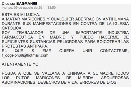 Este miércoles se han conocido los mensajes que llevaron a las fuerzas de seguridad a su detención, que fueron firmados bajo el pseudónimo ‘bagman69’. "Esta es mi lucha. A matar maricones y cualquier aberración anti-humana durante sus manifestaciones en contra de la Iglesia Católica. Soy trabajador de una importante industria farmacéutica y puedo hacer con suficientes sustancias peligrosas para boicotear las protestas antipapa. El que se me quiera unir contácteme: f_cogelon69@hotmail.com. PD: Que se vallana a chingar a su madre todos los putos maricones de mierda, asquerosas abominaciones, desechos de vida, errores de Dios", decía el primero de ellos.