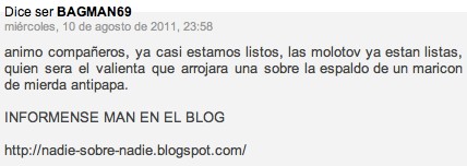 Ánimo compañeros, ya casi estamos listos, las molotov ya están listas, quien será el valienta que arrojara una sobre el espaldo de un maricon de mierda antipapa. Infórmense man en el blog nadie-sobre-nadie.blogspot.com", decía en otro mensaje.
