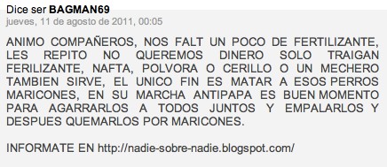 "Ánimo compañeros, nos falta un poco de fertilizante, les repito noqueremos dinero solo traigan ferilizante, nafta, polvora o cerillo o un mechero también sirve, el único fin es matar a esos perros maricones, en su marcha antipapa es buen momento para agarrarlos a todos juntos y empalarlos y después quemarlos por maricones. Infórmate en nadie-sobre-nadie.blogspot.com", decía un cuarto texto.
