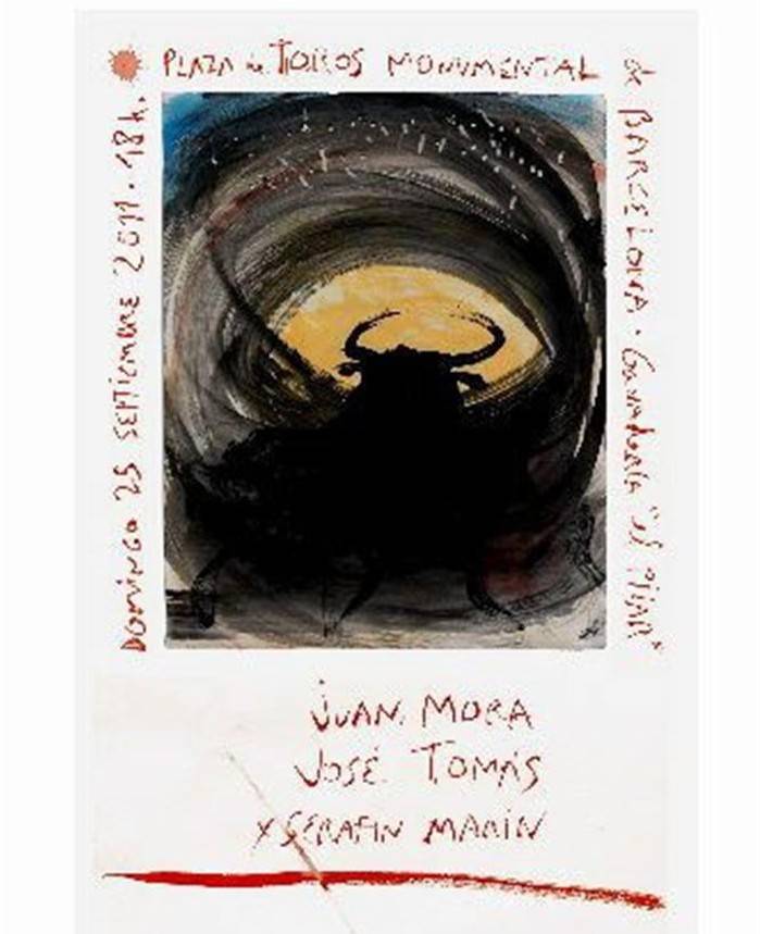 El pintor mallorquín Miquel Barceló ha pintado el cartel promocional de la última corrida de toros que tendrá lugar en la Monumental de Barcelona, antes de que entre en vigor la prohibición de las corridas en Cataluña, el 1 de enero de 2012.