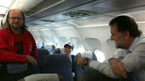 El presidente del PP, Mariano Rajoy, ha continuado este viernes su actividad en la cuenta de Twitter que estrenó el jueves y ha aprovechado la red social para relatar un encuentro que ha tenido en un avión con el director y actor Santiago Segura y con el cantante Julio José Iglesias, hijo de Julio Iglesias. Además, ha colgado una foto de los tres en el interior de la aeronave.