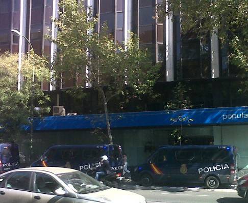 Varios furgones policiales están apostados en los alrededores de la sede nacional del Partido Popular por la presencia de no más de medio centenar de personas que lanzan consignas contra Esperanza Aguirre, en relación a su plan de ajuste en el sistema educativo.