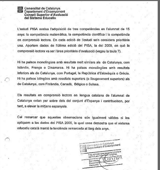 (Documento de la Generalidad sobre el informe PISA)