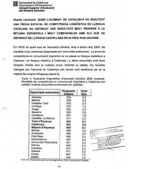 Las conclusiones que se sacaron ya en ese momento son las carencias de los alumnos catalanes en el conocimiento del castellano en expresión escrita, gramática y literatura, cuyo nivel global del dominio del castellano es inferior al de catalán en 7 puntos porcentuales. En Primaria los datos son peores y mientras la comprensión de un texto literario en catalán alcanza un 75,06 por ciento, en castellano tan sólo alcanza el 55,86 por ciento, 20 puntos por debajo.
