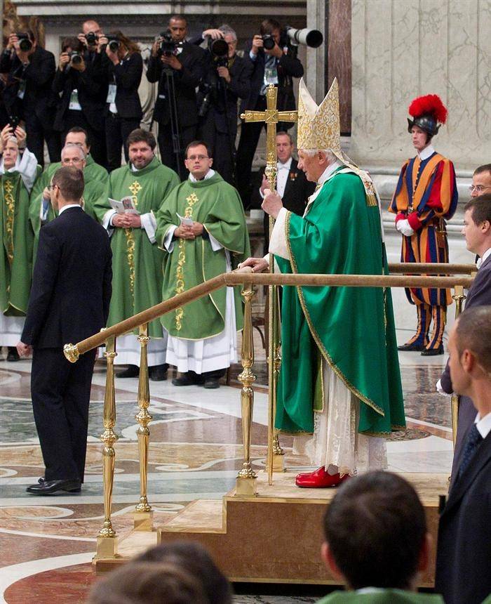 Como había sido anunciado ayer por el portavoz vaticano, el jesuita Federico Lombardi, Benedicto XVI entró hoy en la basílica de San Pedro en pie y sujetado a una barandilla de una plataforma motorizada que le condujo a través de la nave central al altar mayor, en un recorrido de cerca de cien metros.