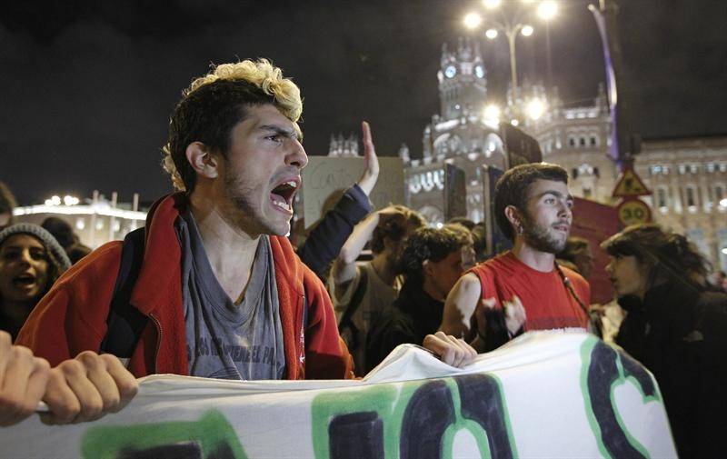 Por su parte, otro grupo de jóvenes, se han subido a los andamios del edificio del Tío Pepe, en el kilómetro 0, para colgar una gran pancarta a favor de los servicios públicos como derechos y no como "negocios". En este caso no se han producido incidentes.