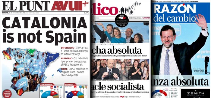 El País tampoco anda muy fino en su titular de portada. "La crisis da todo el poder a Rajoy". Ya en el interior especifica que "España le entrega al PP todo el poder". Y desde el subtítulo empieza a atizar a Zapatero hasta en el cielo de la boca. "La gestión económica de Zapatero provoca un retroceso sin precedentes de los socialistas en el Parlamento". Es el aperitivo de lo que le espera en el demoledor editorial. "La incompetencia y falta de densidad política de Rodríguez Zapatero (...) han catapultado a Rajoy a La Moncloa", dice. "Lo mismo que no fue Rajoy quien perdió las elecciones de 2004, sino Aznar, en esta ocasión el derrotado no es Rubalcaba, sino Zapatero". Así que va a poner orden y pide "su dimisión inmediata como líder del Partido Socialista y la convocatoria de un congreso urgente que restaure las estructuras de una formación política amenazada de ruina por la ausencia de maña y el exceso de mañas que su actual secretario general exhibe". La leche, qué manta de tortas. Pero aún no se ha quedado a gustito. "Que el señor presidente del Gobierno no se sabe ir es algo comprobado por todos los españoles", y tras una larga narración de todos los trapicheos, idas, venidas etc del presidente le manda a freír monas. "Su familia y su casa de León le esperan para disfrutar de un descanso bien ganado". ¿Les suena a despedida y cierre? Pues qué va, no se vayan, todavía hay más. "Los resultados de las elecciones de ayer (...) ponen de relieve que gran parte" del "caudal político" del socialismo "ha sido dilapidado de manera insensata e innecesaria durante los últimos años". "Váyase José Luis Rodríguez Zapatero en buena hora de sus responsabilidades al frente del partido y permita a los socialistas reordenar su casa antes de que los vendavales de este invierno degeneren en tornado". Y ya está. Ya se ha quedado a gusto.
