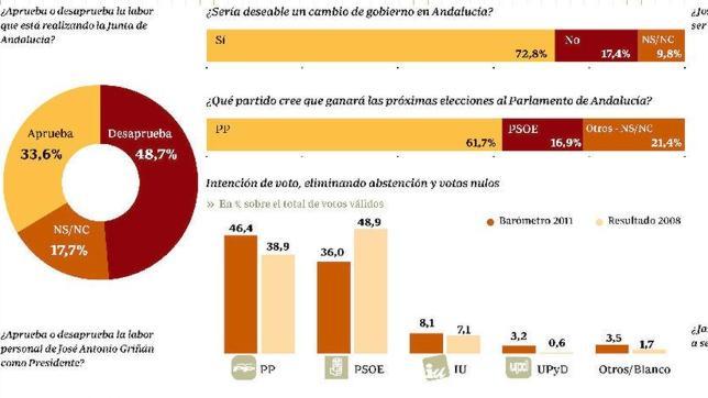 4) El PP obtendría el 46,4% de intención de voto frente al 36% que alcanzaría el PSOE de Griñán. La diferencia entre los dos partidos mayoritarios, un 10,4%, sería suficiente, según el director general del IESA, Eduardo Moyano, para que Javier Arenas gobernara en Andalucía sin necesidad de coalición con otros partidos. Esta es la segunda vez consecutiva que el sondeo del IESA otorga la mayoría absoluta al PP-A, puesto que en el barómetro de 2010, la diferencia entre los dos partidos fue del 9,1%.