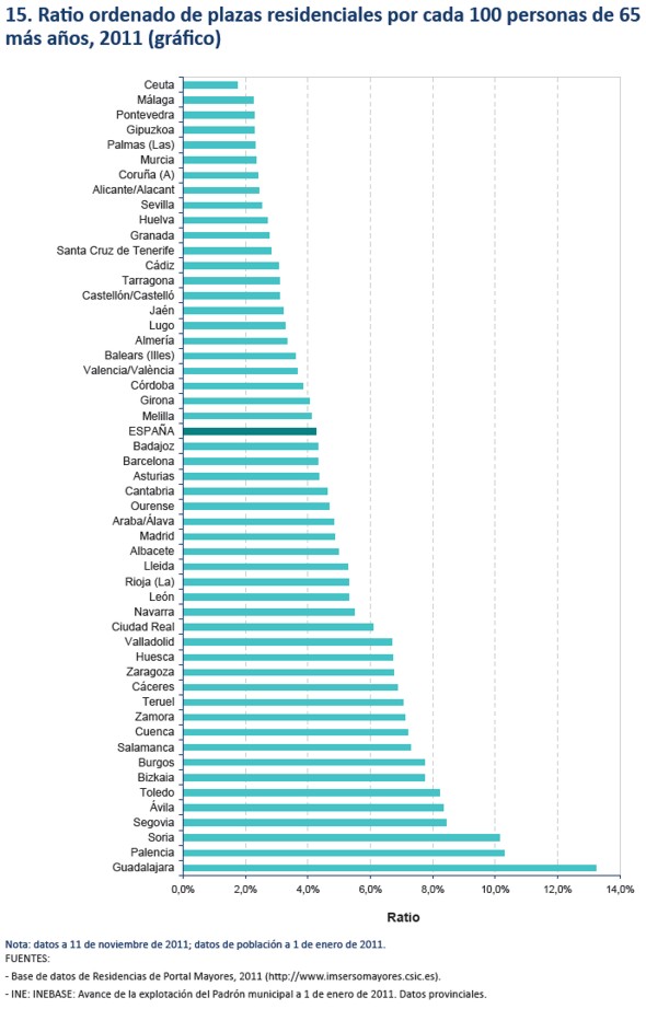 En España hay censadas 5.293 residencias, 688 de ellas en Andalucía, menos del 13 por ciento, mientras que la población andaluza asciende al 18 por ciento del total español. Las plazas en España suman un total de 344.310 por lo que poco más del 4,3% de la población candidata a vivir en una de ellas puede hacerlo. Castilla-La Mancha (7,4) y Castilla y León (7,3) se sitúan a la cabeza.