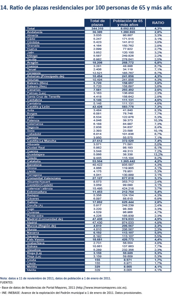 En España hay censadas 5.293 residencias, 688 de ellas en Andalucía, menos del 13 por ciento, mientras que la población andaluza asciende al 18 por ciento del total español. Las plazas en España suman un total de 344.310 por lo que poco más del 4,3% de la población candidata a vivir en una de ellas puede hacerlo. Castilla-La Mancha (7,4) y Castilla y León (7,3) se sitúan a la cabeza.