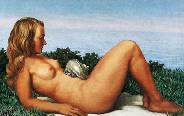 La pintura L'Olympia es un desnudo de Georgette Magritte, esposa del artista, sobre un fondo de un paisaje junto al mar.