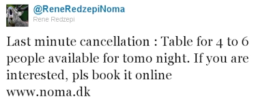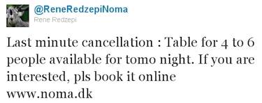 "Cancelación de última hora: Mesa para entre 4 y 6 personas disponible para mañana por la noche. Si le interesa, por favor reserve a través de internet en nuestra página web", puede leerse en el perfil de Rene Redzepi, titular de la cocina de Noma y antiguo alumno de Ferran Adrià en El Bulli.