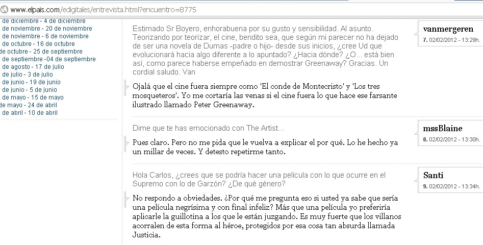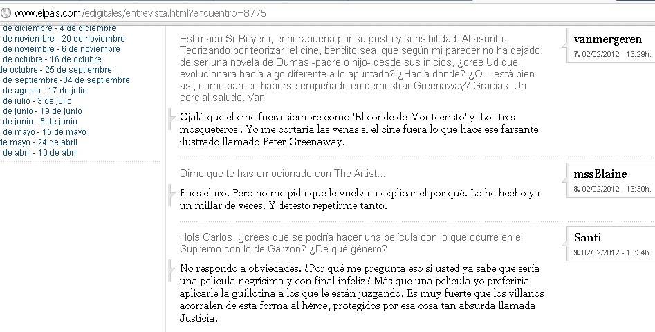 El crítico de cine y televisión de El País, Carlos Boyero, escribió en un encuentro virtual con los lectores de la versión digital del diario de PRISA que "preferiría aplicarle la guillotina" a los que están juzgando a Baltasar Garzón.