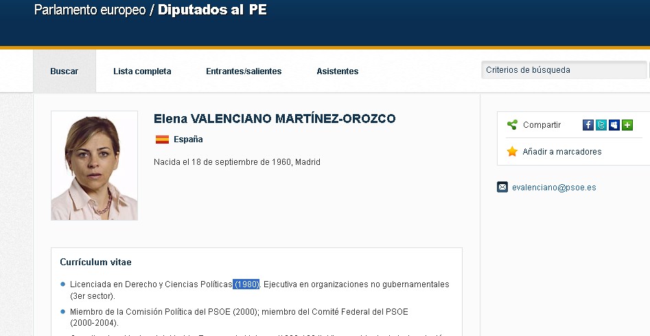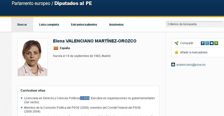 Se da la circunstancia de que en su currículum del Parlamento Europeo sí figura que es licenciada en Derecho y Ciencias Políticas. Según ese segundo documento en la red, en el que figura el año 1980 como fecha de finalización de las dos carreras, Valenciano –que nació en 1960- tenía ya dos licenciaturas cuando sólo contaba veinte años, como subrayó en su blog el periodista Santiago González.