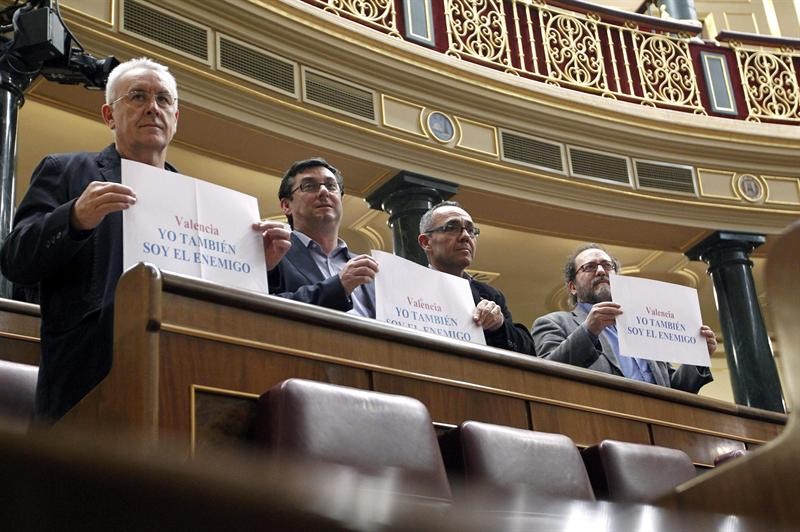 Los del grupo de izquierdas rezaban "Valencia: Yo también soy el enemigo", mientras que en los de los republicanos catalanes se podía leer, en lengua catalana, "Dimissions".