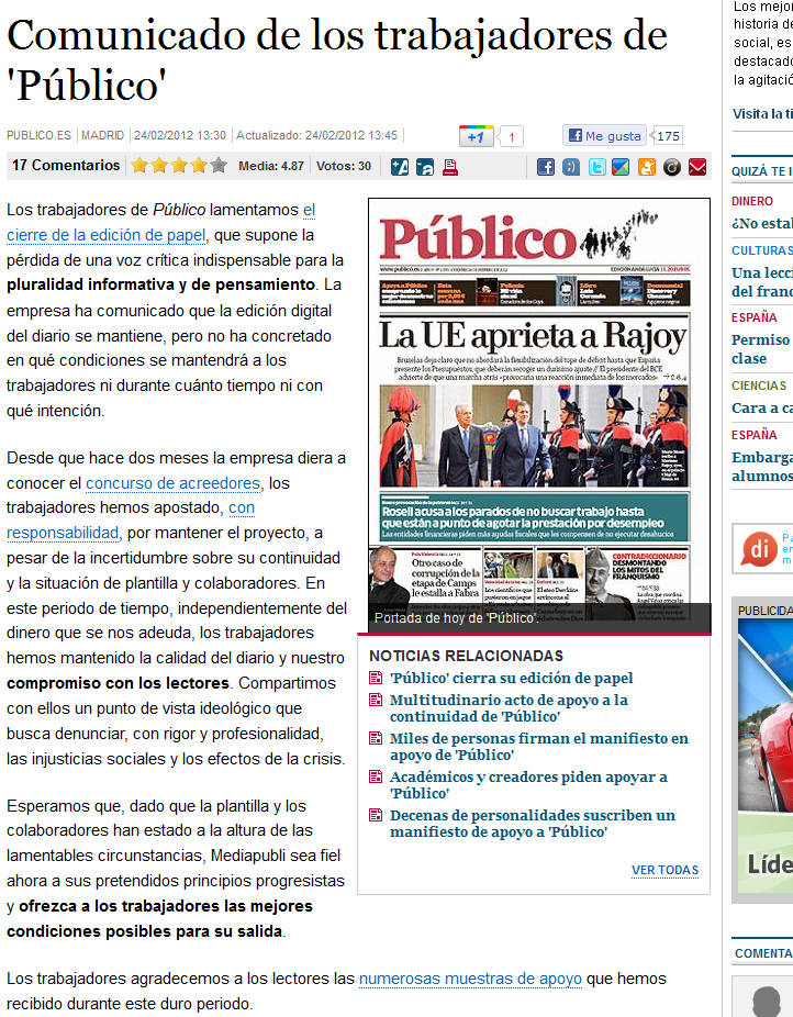 Los trabajadores de Público han decidido hacer saber su opinión sobre el cierre de su edición en papel, que se ha dado a conocer esta misma mañana. Y para hacerlo han recurrido a su propia página web, en la que publican un comunicado en el que lo más llamativo es la exigencia de que "Mediapubli sea fiel ahora a sus pretendidos principios progresistas y ofrezca a los trabajadores las mejores condiciones posibles para su salida".