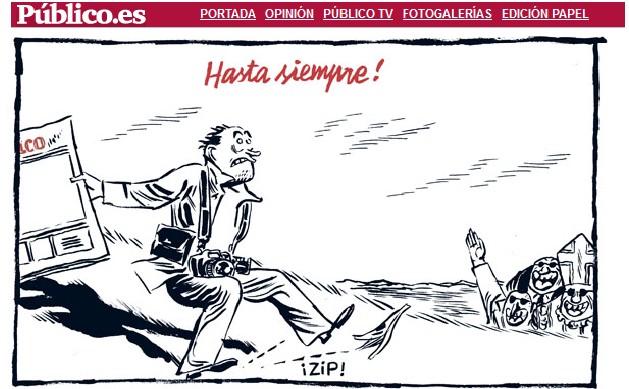 Seguirá su andadura en internet, donde este sábado el caricaturista de Público tiene una curiosa forma de despedir su cabecera de papel. Reinterpreta la famosa fotografía de la guerra civil española inmortalizada por Robert Capa en la que se ve un hombre armado en el momento en que le alcanza un disparo. La foto se llama "muerte de un miliciano".