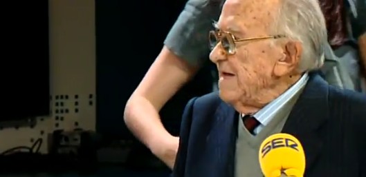 En mitad del vídeo aparecen imágenes de una tertulia de la Cadena SER en la que participa Carrillo. A la vez, una voz en off narra: "Santiago Carrillo se mantiene activo, haciendo gala de una memoria y una lucidez envidiables. La tarde de los lunes acude a los estudios de la Cadena SER, en el centro de Madrid, para participar en una tertulia de actualidad (...) Es un diálogo de sabios".