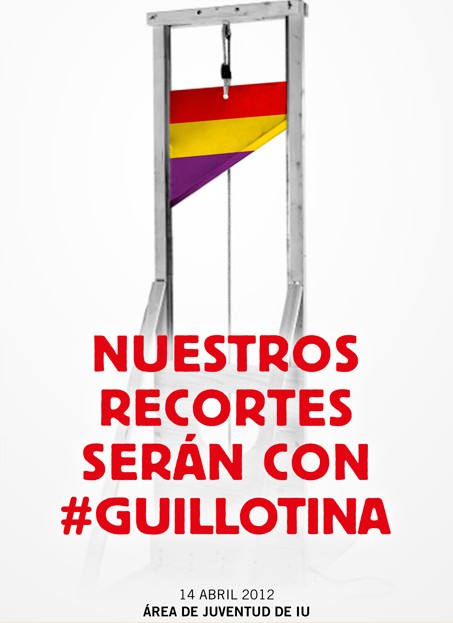 La izquierda ha resucitado y reeditado la guillotina. Un día antes del aniversario de la proclamación de la II República, a través de la red social Twitter, las juventudes de Izquierda Unida avisan: "Nuestros recortes serán con guillotina". Esta afirmación viene ilustrada con la imagen de la mortífera máquina cuya hoja tiene los colores de la bandera republicana.