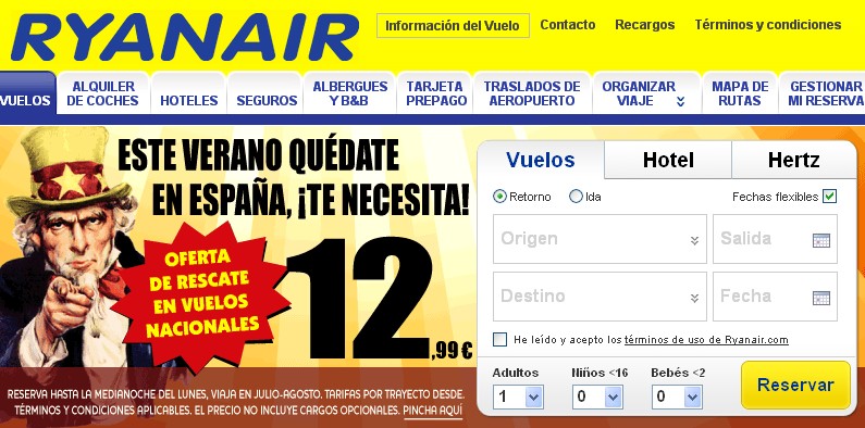Ryanair vuelve a hacer gala de ‘campaña polémica’ para captar clientes. La aerolínea irlandesa utiliza esta vez la situación crítica que vive España para lanzar en su web una oferta de vuelos bajo el eslogan ‘Este verano quédate en España, ¡te necesita!’