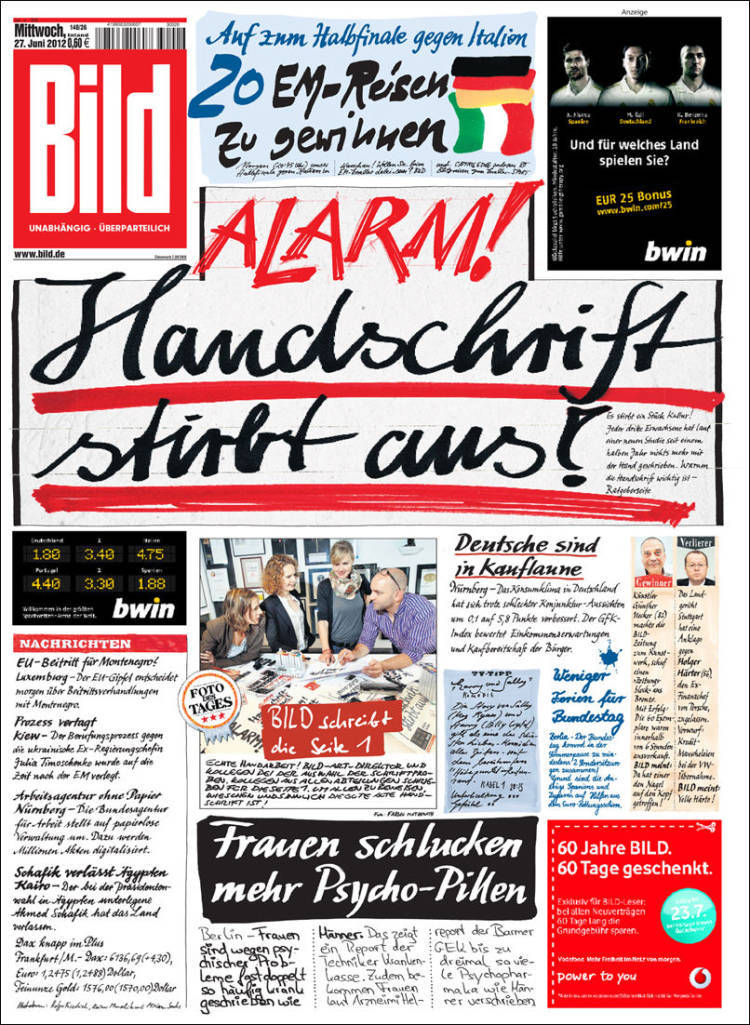 El diario sensacionalista alemán Bild, el más vendido de Europa y famoso por sus fotomontajes y el enorme tamaño de sus titulares, se ha pasado este miércoles a la escritura a mano. El motivo, anunciar "la extinción" de la caligrafía.