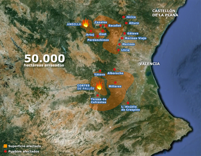 El mismo día en que se producía el fallecimiento de uno de los muchos efectivos que luchan contra el fuego, se conocían las primeras cifras oficiales del devastador incendio. Según ha informado el Consorcio Provincial de Bomberos de Valencia, la superficie calcinada en los incendios forestales iniciados en los municipios valencianos de Cortes de Pallás y Andilla es de