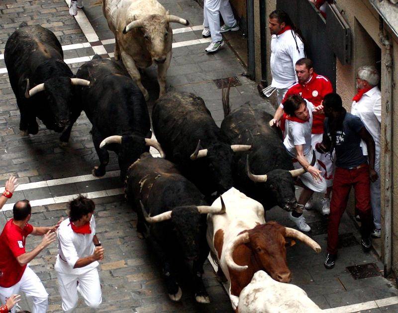 Con un toro negro y un jabonero por delante el grupo ha cruzado la calle Mercaderes sin problemas y ha llegado a la curva de la Estafeta donde los dos primeros han resbalado, lo que ha reagrupado a la torada.