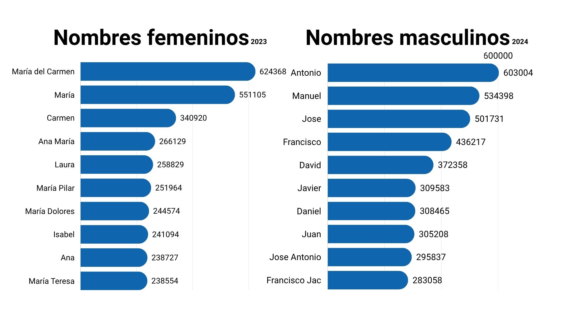 En el caso de los varones Manuel es el segundo más repetido con 534.398 y José el tercero con total de 501.731 veces usado. Los siguientes son: Francisco, David, Javier, Daniel, Juan, José Antonio y Francisco Javier.