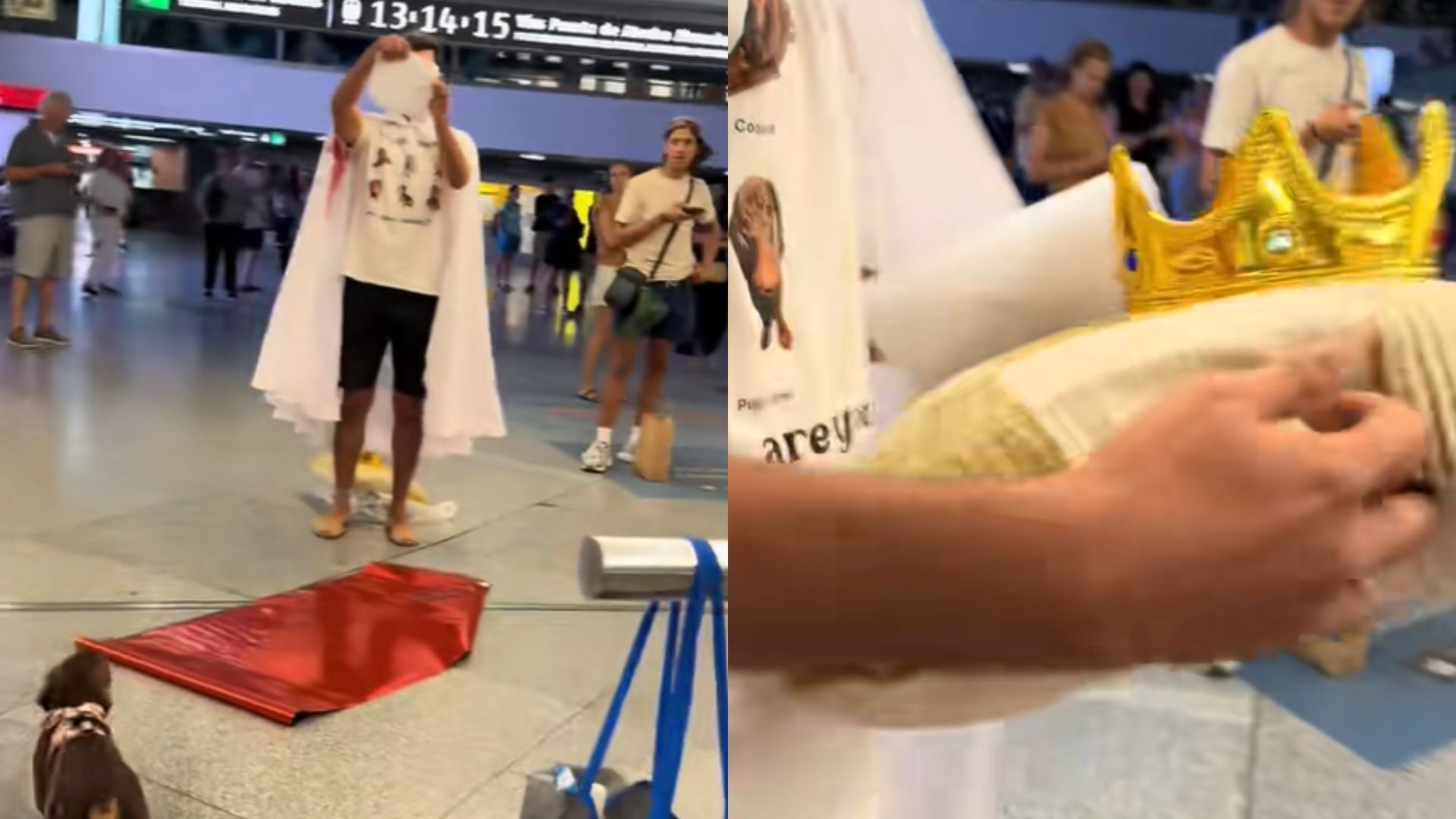 Las llegadas a casa después de un largo viaje pueden ser emotivas, pero esta ha sido digna de una película. Una joven fue recibida por su novio en la estación de tren de Madrid de una forma que no esperaba: con una alfombra roja, una capa, una camiseta personalizada y hasta una coronación simbólica.