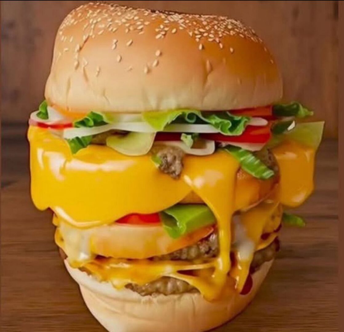 La imagen, generada por inteligencia artificial, muestra una hamburguesa visualmente exagerada: pan brillante con semillas perfectamente colocadas, lechuga crujiente, tomate rojizo y un queso fundido que cae en cascada de forma caricaturesca. No hay rastro humano claro en la imagen, y sin embargo, miles de usuarios afirman distinguir una cara reconocible entre las capas de ingredientes.