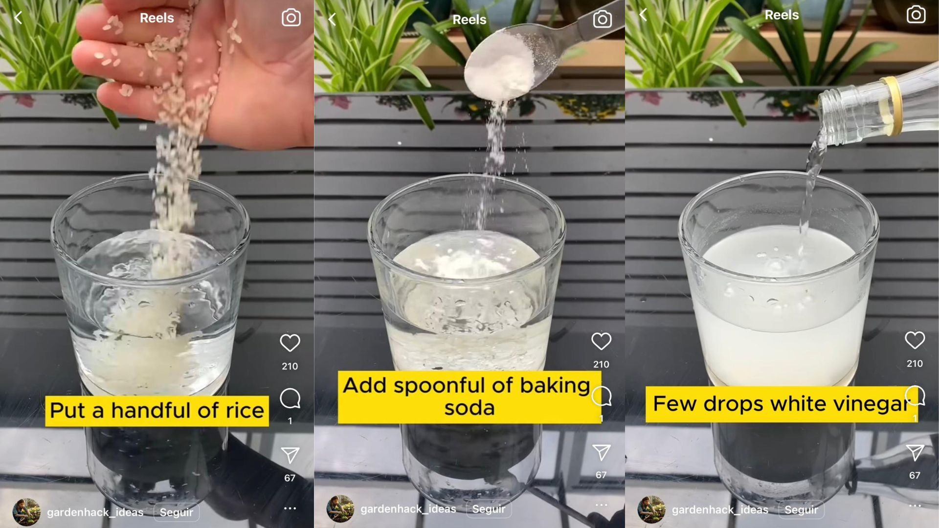 - Nivel experto: se debe verter en un recipiente dos partes iguales de arroz y agua. Después, se pone a hervir hasta que los granos de arroz estén blandos. Una vez que se obtiene la textura del arroz necesaria, se cuela el agua y se deja enfriar. Finalmente, se mezcla el agua con una cucharada de bicarbonato y unas gotas de vinagre, y se riegan las plantas con un pulverizador.