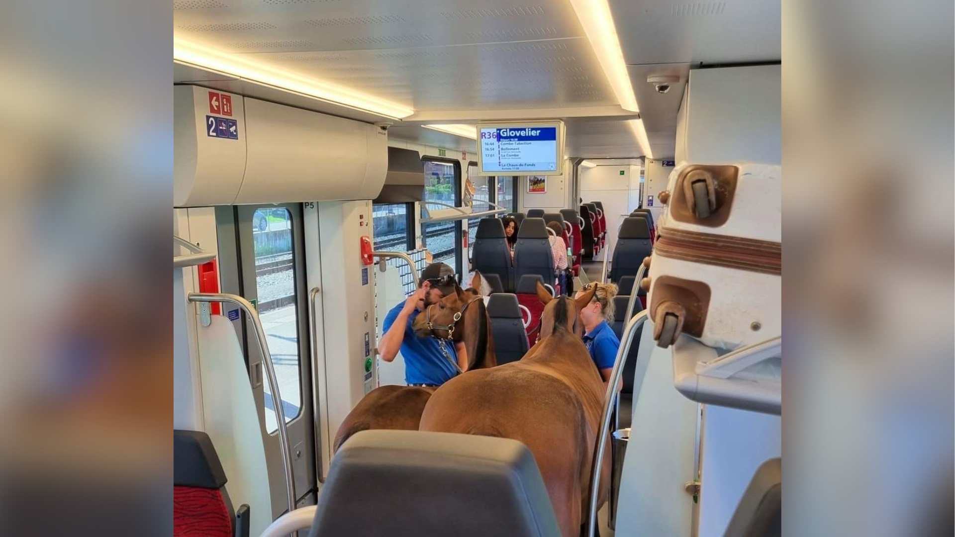 Los pasajeros de un tren regional en el cantón del Jura, al noroeste de Suiza, que cubría la ruta entre Glovelier y La Chaux-de-Fonds, pasando por Saignelégier, fueron testigos de una escena insólita el pasado fin de semana: una yegua y su potro intentaban viajar como cualquier otro usuario del servicio.