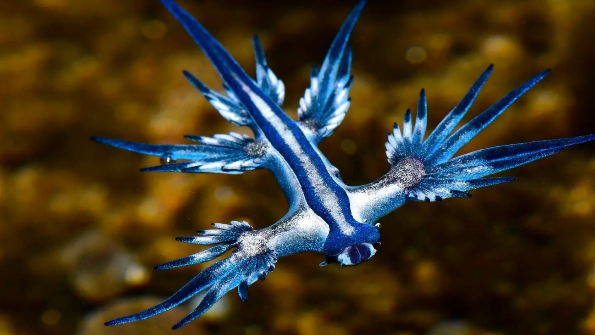 Conocido científicamente como Glaucus atlanticus, el dragón azul es una babosa marina perteneciente a la familia de los nudibranquios. A pesar de medir tan solo entre 3 y 4 centímetros, su apariencia es espectacular: su cuerpo presenta un tono azul plateado en el dorso y azul pálido en el vientre, con seis apéndices ramificados que se asemejan a unas pequeñas alas. Este diseño actúa como camuflaje en la superficie del mar.