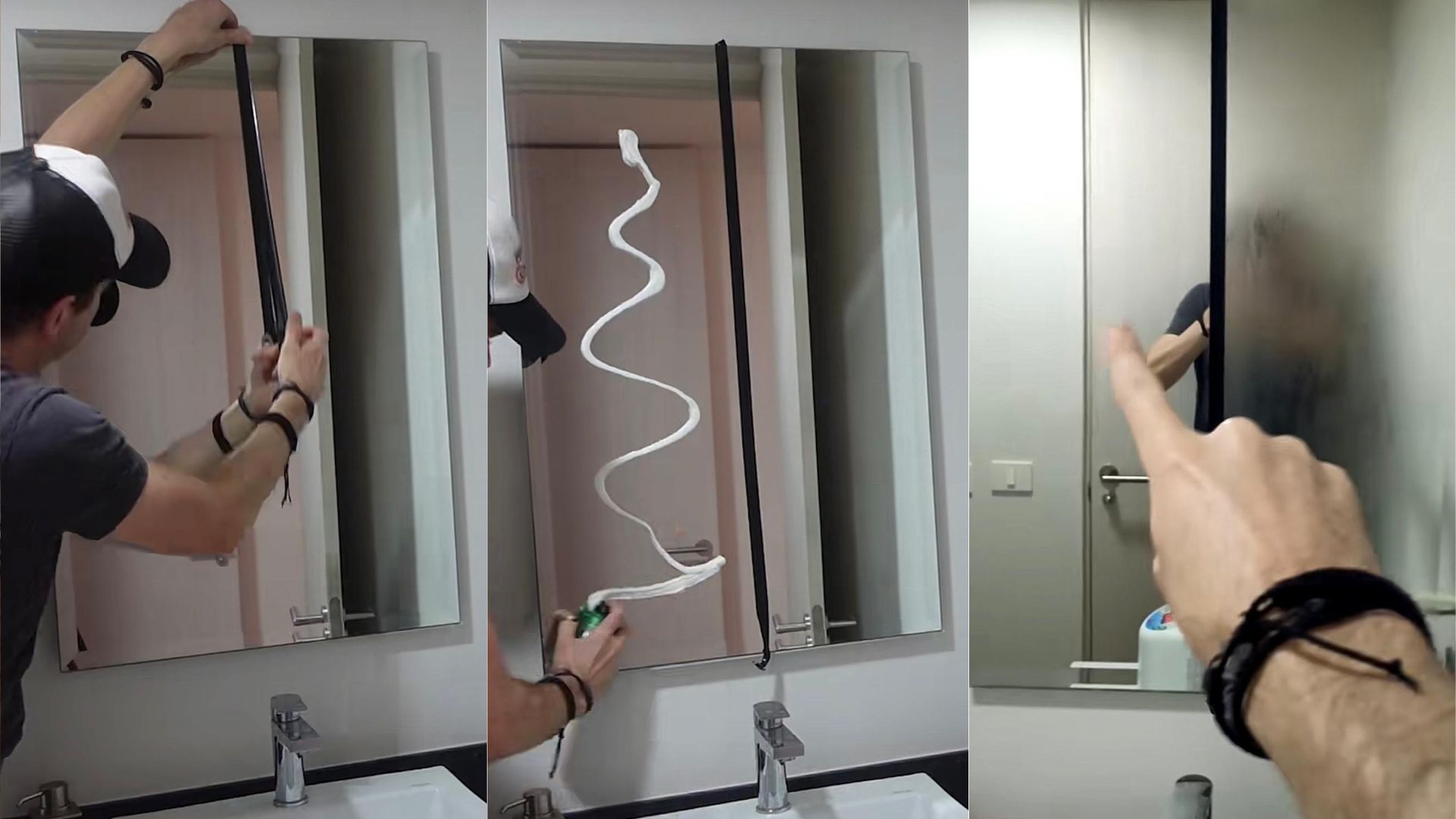 Para comprobar la veracidad del método, Jimmy aplica el producto únicamente sobre un lado del espejo. "Dividí el espejo en dos partes", explica en el vídeo, mientras coloca un trozo de cinta aislante negra para marcar la separación. Esta técnica permite observar con claridad la diferencia entre la zona tratada y la que no ha recibido ningún producto, y así visualizar la efectividad del truco.