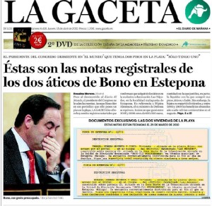La Gaceta publica los registros notariales de los áticos que Bono negó tener. El presidente del Congreso justificó su patrimonio con sus rentas, las de su mujer y la Hípica Almenara. Sin embargo, según este periódico, Bono falta a la verdad cuando afirma que la hípica ganó entre 2006 y 2008 cerca de 800.000 euros.