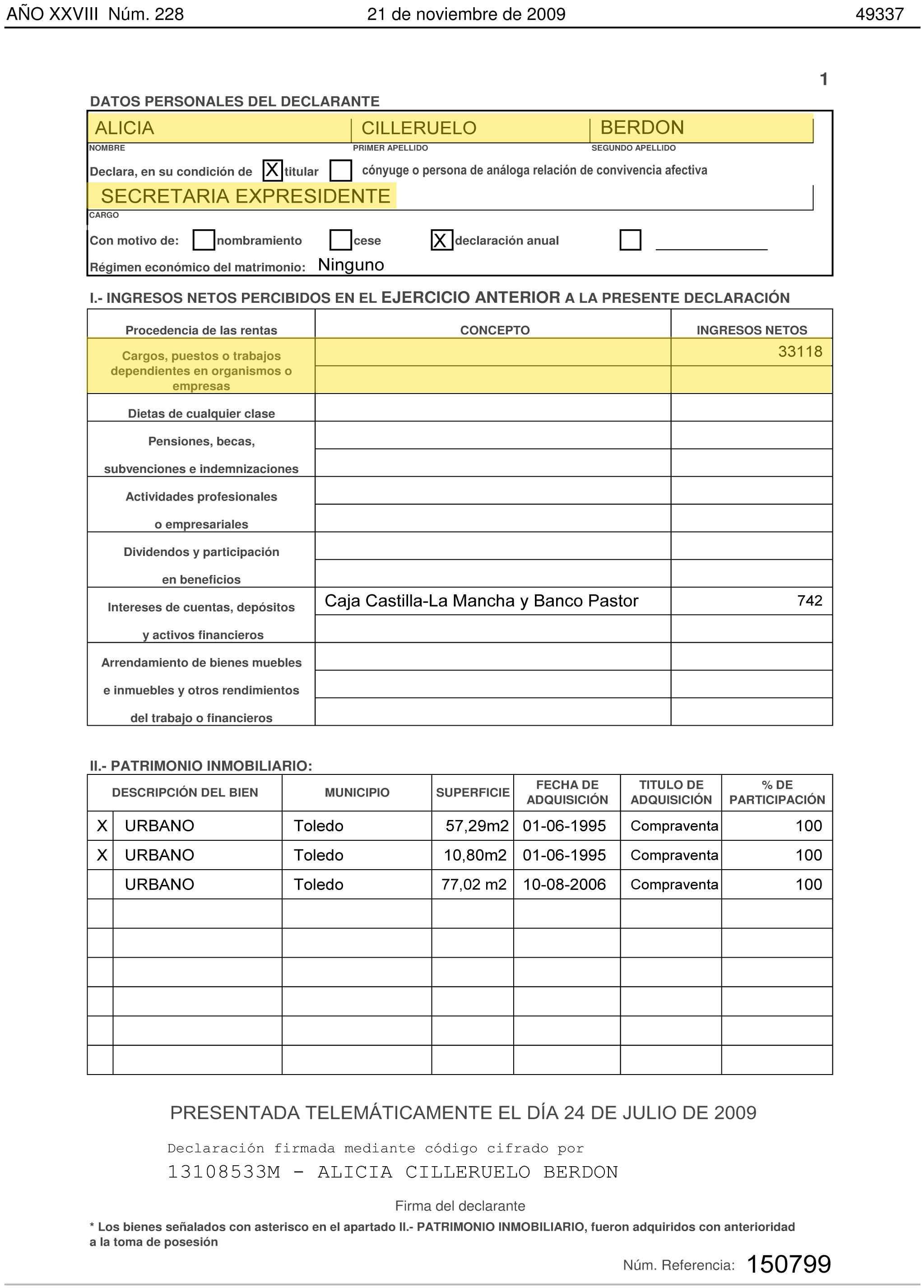 La secretaria del ex presidente manchego, debido a su puesto de funcionaria pública, realiza todos los años la declaración de bienes, rentas y actividades. Destaca sobremanera que nunca ha declarado que haya cobrado algún tipo de cantidad por desempeñar los cargos de administradora en las empresas de José Bono. En 2009, únicamente declaró su sueldo de secretaria de Bono, que asciende a 33.118 euros. Eso sí, de un año a otro vio como sus honorarios crecían en torno a 3.000 euros anuales.
