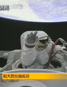 Sin embargo, finalmente la imagen regresó y Zhai reapareció ondeando en el espacio una bandera nacional china que le había entregado Liu, quien sólo asomó medio cuerpo al exterior y llevaba un traje Orlan de tecnología rusa.