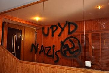 Pero este no ha sido el único incidente producido en los últimos días en Baleares. Este martes, la sede de Unión Progreso y Democracia en Palma apareció marcada por pintadas tanto en la fachada como en el interior del portal en el que se encuentra. Así, pintaron esvásticas y escritos como “UpyD nazis”.