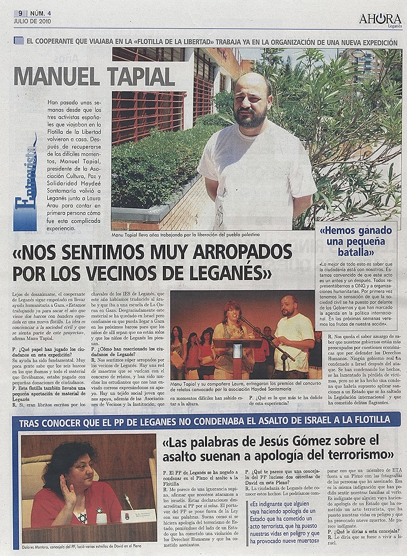 Dentro de estos encuentros con la prensa Tapial concedió una entrevista a un periódico gratuito de Leganés en la que, además de su habitual mensaje antiisraelí, con frases como "es un Estado que ha cometido una violación de los Derechos Humanos y que ha cometido asesinatos", dedicaba un espacio particular al PP en su localidad, que se negó a condenar a Israel por los hechos.